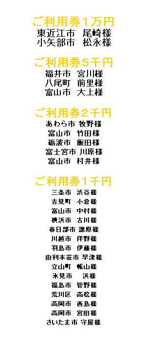 ご宿泊リピーターになろうキャンペーン! 25年度上半期 宿泊ご利用券 ご当選発表!! アンケートにご回答いただいたお客様から抽選 (上半期 4月〜9月分)