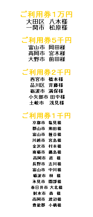 ご宿泊リピーターになろうキャンペーン! 26年度下半期 宿泊ご利用券 ご当選発表!! アンケートにご回答いただいたお客様から抽選 (下半期 10月〜3月分)